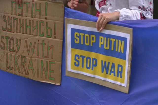 Vendredi, au lendemain de l’invasion russe, plusieurs personnes ont brandi des affiches appelant les nations à aider à mettre fin à l’attaque de la Russie contre son voisin.