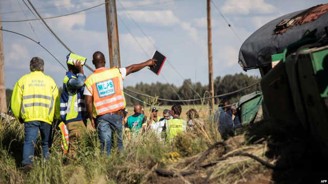 Des inspecteurs regardent un train accidenté près de Kroonstad, à 110 kilomètres de Johannesburg, le 4 janvier 2018 | Photo : AFP