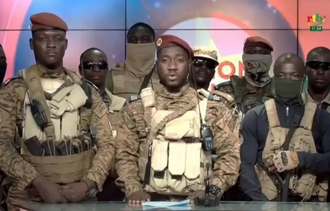 Le capitaine Kiswendsida Farouk Azaria Sorgho, membre de la junte, lit à la télévision un communiqué aux côtés du putschiste Ibrahim Traoré | Photo: RTBF / AFP
