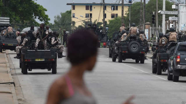 Des militaires patrouillent à bord des véhicules près de l’état-major de l’armée après des tirs entendu non loin d’Abidjan, 12 mai 2017 | Photo : AFP