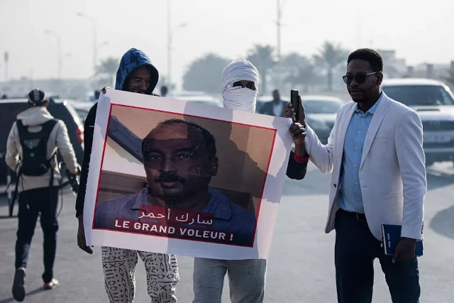 Deux hommes brandissent une pancarte portant l’inscription « le grand voleur » sur le portrait de Mohamed Ould Abdel Aziz, à Nouakchott, le 25 janvier 2023 | Photo: AFP