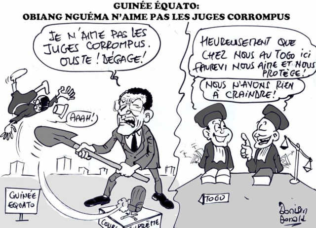 Le 15 janvier 2018, on apprend que le président de Guinée Équatoriale avait fait une déclaration semblable à ce que Faure Gnassingbé avait dit un 26 avril 2012 au sujet de la minorité qui accapare les richesses du pays. « …Malheureusement nous observons que la corruption continue de dominer la justice. Les juges ne respectent pas le droit ni la loi (…) ils fomentent l’insécurité juridique qui chasse le capital étranger, ils appliquent des sanctions non prévues par la loi pour leur profit personnel et ils perçoivent des honoraires et taxes extraordinaires fabriqués pour extorquer les administrés », aurait constaté Theodoro Obiang. Certainement que les juges véreux pensaient qu’après plus de 7 mois sans réaction, le président aurait oublié de donner suite à son constat. Eh bien non, vendredi dernier, comme un coup de tonnerre, la nouvelle est tombée. « Sur proposition du Conseil supérieur du pouvoir judiciaire, je démets de ses fonctions de président de la Cour suprême monsieur Juan Carlos Ondo Angue », indique un décret présidentiel lu à la télévision d’Etat, la TVGE.