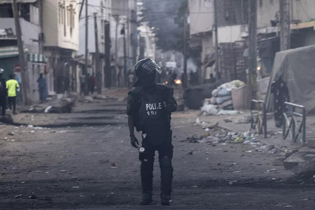Un policier surveille une route après que des manifestants ont brûlé des pneus et bloqué des routes à Dakar, le 3 juin 2023 | Photo: AFP