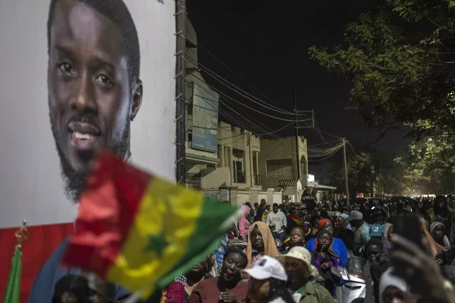 Des partisans de Bassirou Diomaye Faye devant son quartier général de campagne en attendant les résultats de l’élection présidentielle, à Dakar, Sénégal, le 24 mars 2024 | Photo: AP