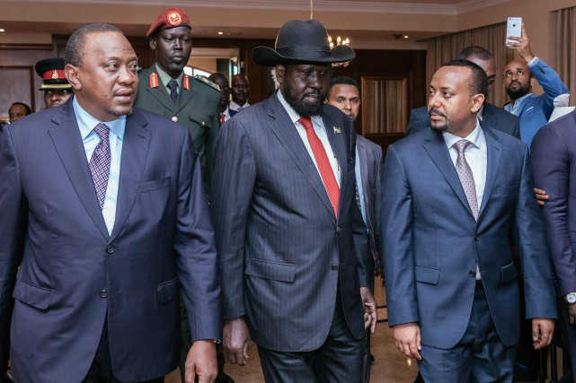 Les bureaux du Premier ministre éthiopien Abiy Ahmed, qui préside l’Igad (Autorité intergouvernementale pour le développement), l’organisation régionale qui oeuvre depuis de longs mois à réactiver le processus de paix, avaient publié des photos des trois hommes se donnant l’accolade.