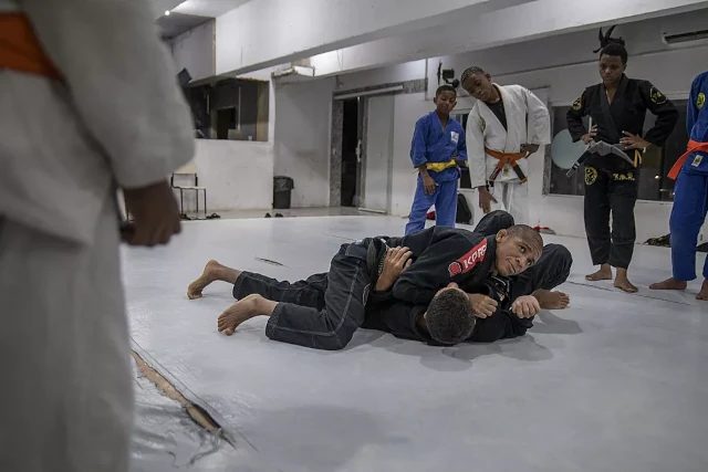 Dans un bidonville situé au sommet d’une colline et coincé entre deux des quartiers les plus riches de Rio de Janeiro, des enfants pratiquent le jiujitsu brésilien, espérant suivre les traces des ceintures noires dont les portraits graffités décorent les murs de leur salle de sport.