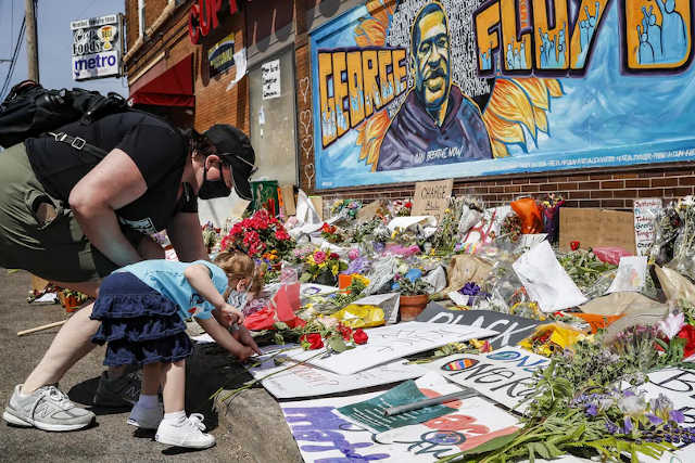À Minneapolis, des gens se sont rassemblés dimanche avec balais et fleurs à la main à l’endroit où George Floyd a été arrêté par les policiers, soutenant qu’il était important de protéger ce qu’ils appellent un « espace sacré ». L’intersection en question a été bloquée avec des cônes de signalisation, tandis qu’un anneau de fleurs a été disposé au sol.