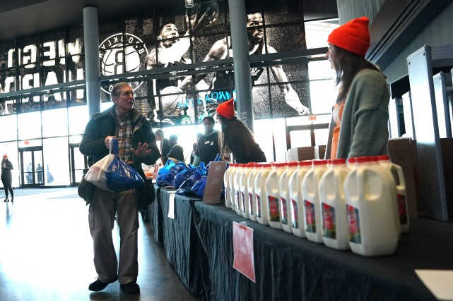 Dans le hall d’entrée du célèbre Barclays Center, plus habitué à accueillir des concerts et des rencontres sportives que des opérations caritatives, des bénévoles ont procédé à la distribution quelques heures durant.
