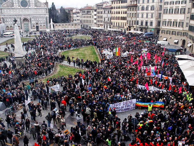 Sur les banderoles brandies par les manifestants on pouvait lire « Idy était un homme de paix, nous ne voulons pas faire d’histoires », « Florence antifasciste », « Florence, du berceau de la Renaissance à la barbarie, restons unis » ou encore « Nardella, la vraie dégradation c’est toi, nettoyons la ville du racisme ».