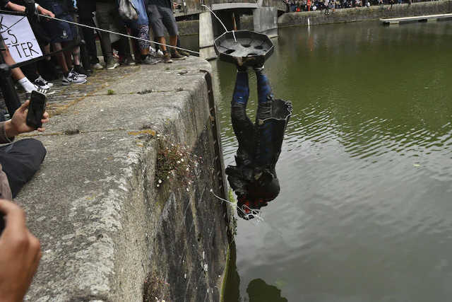 La statue d’Edward Colston, qui faisait controverse depuis des années à Bristol, a ensuite été traînée dans la cité portuaire avant d’être jetée, aspergée de peinture rouge, dans la rivière Avon.