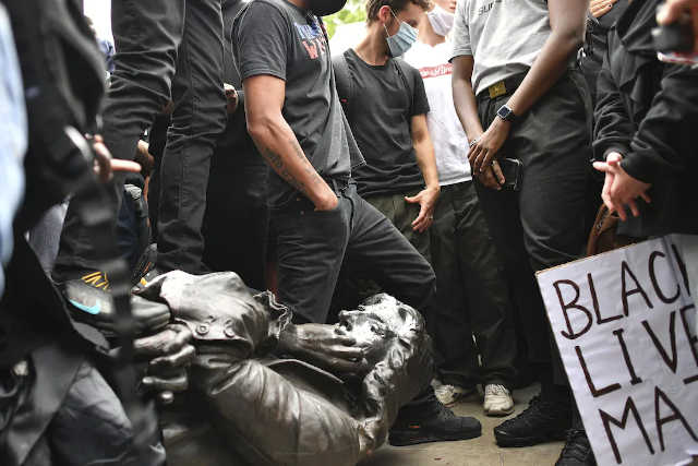 L’un d’eux se fait photographier agenouillé sur le cou de la statue, reproduisant le geste du policier blanc accusé du meurtre non prémédité de George Floyd après une intervention policière violente, et qui a déclenché un mouvement de protestation mondial contre le racisme et les brutalités policières.