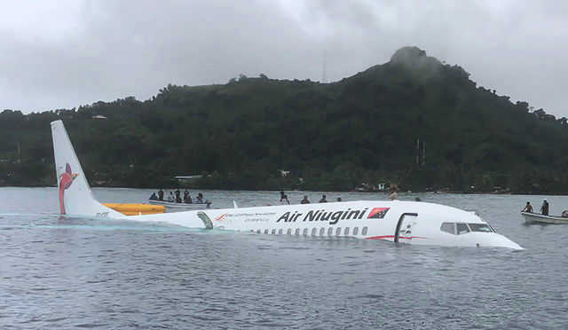 Le Boeing 737 d’Air Niugini a raté la piste d’atterrissage de l’aéroport de Weno, île de Micronésie, pour se retrouver dans le lagon Chuuk, où il a immédiatement commencé à couler et a fini partiellement englouti.
