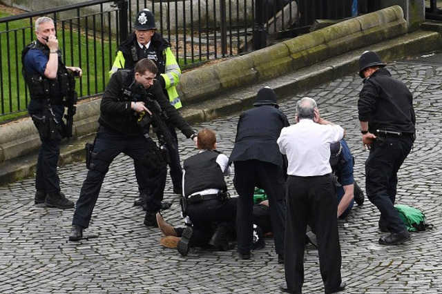 Après avoir embouti son SUV gris sur le bas-côté de la rue, l’homme a couru vers les grilles du Parlement avant de poignarder un policier. La police a fait feu sur lui alors qu’il essayait de s’attaquer à un deuxième officier.