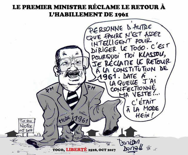 Alors que les Togolais dans leur écrasante majorité réclament la Constitution de 1992 qu’ils se sont librement donnée pour donner une chance à l’alternance démocratique comme ça se fait dans tous les pays normaux, certains Togolais entièrement à part, avec à leur tête, le Premier ministre à la veste zazou, agitent la Constitution de 1961 qui trace une autoroute pour la présidence à vie. Certains griots, dans leurs délires, sont allés jusqu’à dire que c’est cette constitution qui doit être imposée au Togo.