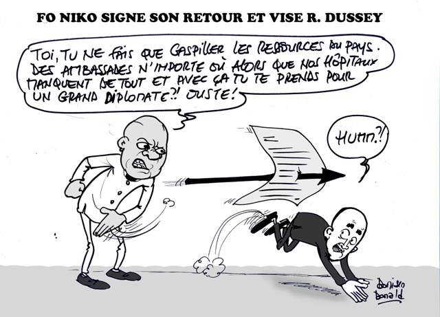 Fo Nico reproche à Roberto von Dussey son bling-bling au ministère des Affaires étrangères, avec le décrochage de relations diplomatiques avec « gné n’importe » quel pays. Morceaux choisis : « (…) Depuis que vous avez été nommé, vous vous permettez par narcissisme de créer en désordre des ambassades dans des pays sans intérêt pour notre peuple. Vous ignorez ainsi que les rapports entre les États doivent être mutuellement avantageux et que leur coopération doit être féconde et reposer sur la communauté permanente des intérêts de leurs peuples. Avec le même agissement déconcertant, vous avez cru utile d’organiser un concours frivole et superflu, couronné par un dîner au champagne en l’honneur d’une certaine diaspora, pour célébrer votre réussite personnelle en compagnie de la minorité, qui accapare les richesses du pays ».