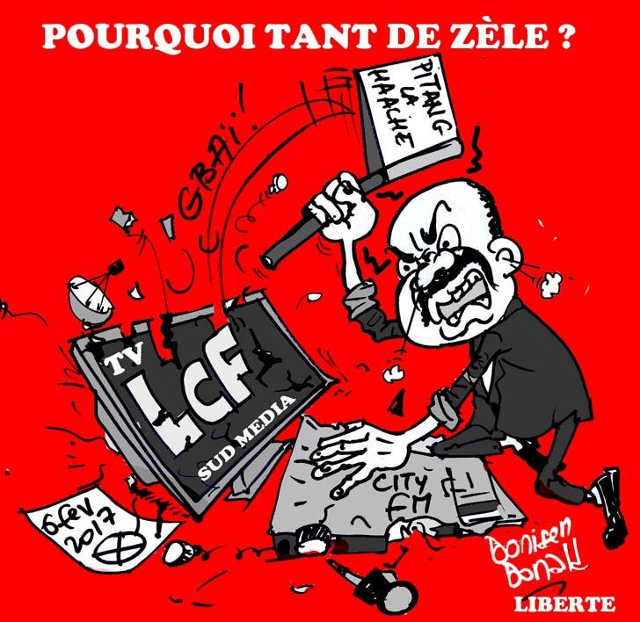Pitang Tchalla dans ses oeuvres de destruction LCF et de City FM de Sud Média | Caricature : Donisen Donald / LibertÉ
