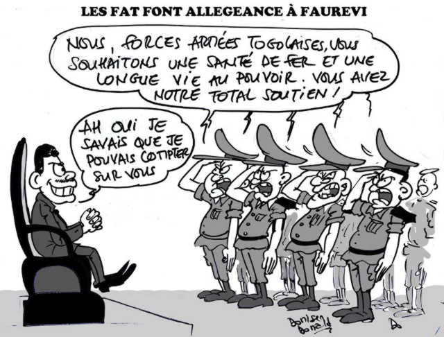 Cette appréciation de la gouvernance de leur champion a laissé place à la phase la plus importante de ce cérémonial, à savoir l’allégeance. Les FAT ont tenu à réaffirmer leur loyauté à leur chef suprême. Et comme par hasard, cela se passait le jour anniversaire des 50 ans de Faure Gnassingbé ! Le Prince peut donc dormir tranquille, l’armée est à ses côtés quoi qu’il arrive. Une sortie loin d‘être anodine à un moment où la tension monte sur le plan politique, avec la réclamation des réformes constitutionnelles, institutionnelles et électorales par l’opposition qui a ressuscité les manifestations de rue et où Faure Gnassingbé semble isolé au sein de la CEDEAO, en compagnie de son compère Yahya Jammeh avec lequel il refuse la limitation du mandat présidentiel et l’alternance au pouvoir.