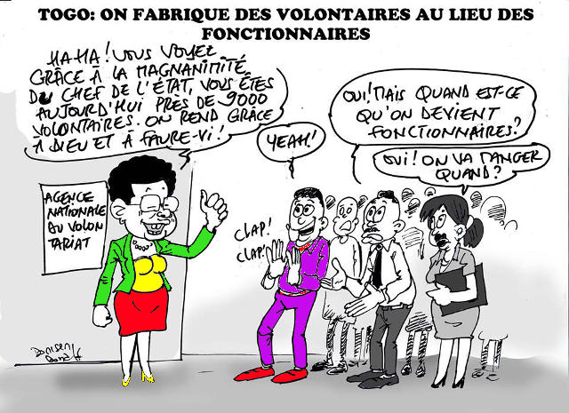 D’après les faits vécus depuis des années au Togo, le volontariat fonctionne plus comme un stage de perfectionnement de longue durée qu’un emploi. En réalité partout dans le monde, les volontaires dans un secteur d’activité ou une entreprise ne sont jamais des employés au même titre que les autres. C’est une situation temporaire qui prend fin quand le volontaire gagne un emploi plus stable. Le traitement, côté salaire, diffère, selon qu’on soit employé ou volontaire.