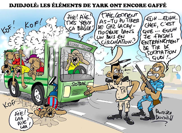 Le policier zélé et un commissaire du commissariat de Djidjolé se rendaient au Palais de justice où devait se dérouler une audition sur une requête de remise en liberté de Pascal Bodjona, lorsque le policier en charge du fusil à gaz lacrymogène a provoqué l’incident. Il aurait enclenché accidentellement son fusil et le projectile de gaz lacrymogène aurait atterri dans le bus sans que le policier sache comment !!!