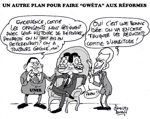 Alors que les Togolais attendent avec impatience cette nouvelle commission pour enfin opérer les réformes, les missi dominici de Faure Gnassingbé ont cru devoir suggérer l’idée d’un référendum pour aller à la 5è République. « Il y a trop de désordre dans la politique actuelle. L’histoire n’est plus ce qu’elle doit être. On ne peut léguer une telle histoire politique à la postérité. Donc il faut procéder par un référendum pour entrer dans une nouvelle République et puis mettre fin à ce désordre », a dardé le président du groupe parlementaire UNIR, Christophe Tchao.