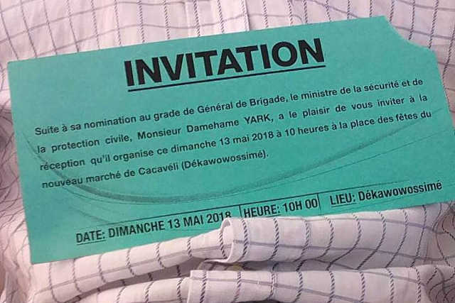 « Suite à sa nomination au grade de Général de Brigade, le ministre de la Sécurité et de la Protection Civile, Monsieur Damehame Yark, a le plaisir de vous inviter à la réception qu’il organise ce dimanche 13 mai 2018 à 10 heures à la Place des fêtes du nouveau marché de Cacavéli (Dékawowossimé) ». C’est ce qu’on pouvait lire sur la carte d’invitation bleu clair. Et la fête a lieu devant plusieurs invités amis, collègues, parents et une partie de la presse dans un décor bleu blanc, couleurs du parti au pouvoir.
