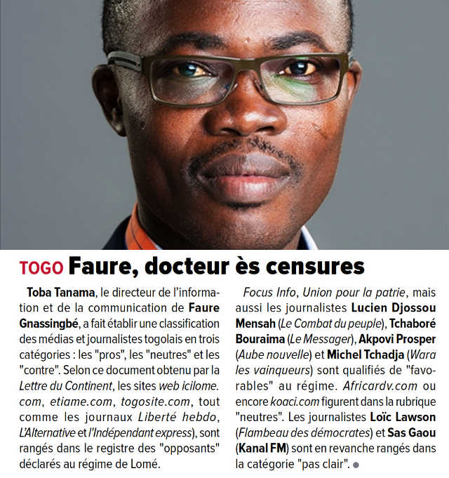 La guerre est lancée sur les médias. Prosper Akpovi (journal panafricain Aube Nouvelle), Lucien Djossou Messan (Combat du peuple), Michel Tchadja (« Wara les vainqueurs »), Loïc Lawson (Flambeau des démocrates), Sas Gaou (le génie animateur du Club de la presse sur Kanal Fm), Tchaboré Bouraïma (Le messager) figurent sur la liste révélée par la Lettre du Continent.