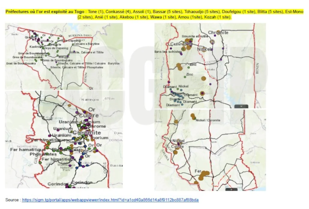 En 2016, Banque mondiale a financé à hauteur de 10 Milliards de Fcfa un projet de développement et de gouvernance minière (PDGM). Ce projet a permis à la Direction générale des mines et de la géologie (DGMG) de mettre en place un cadastre minier du territoire togolais consultable en ligne sur le site internet www.sigm.tg . Ce site gouvernemental nous apprend que l’or est extrait dans de nombreuses préfectures du pays à savoir : Tone, Cinkassé, Assoli, Bassar, Tchaoudjo, Doufelgou, Blitta, Est-Mono, Anié, Akebou, Wawa, Amou, Kozah.