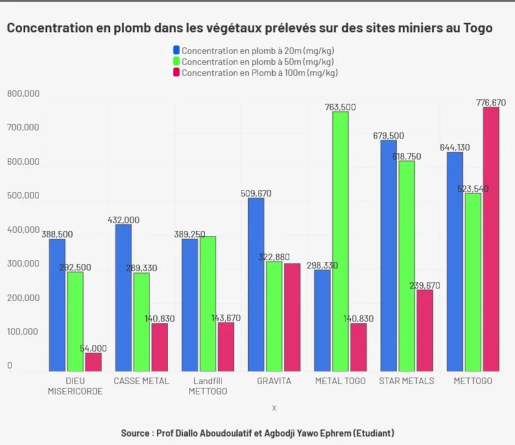 La concentration en plomb dans les végétaux récoltés à 20 mètres du site GRAVITA atteint 509,67 mg/kg, bien au-delà des limites recommandées par les normes internationales de sécurité alimentaire. Le site METTOGO affiche des teneurs similaires, avec une variation d’environ 20 % entre les fruits prélevés à différentes distances du site de recyclage. Soit des valeurs, allant de 644,130 mg/kg à 776,670 mg/kg pour les fruits.