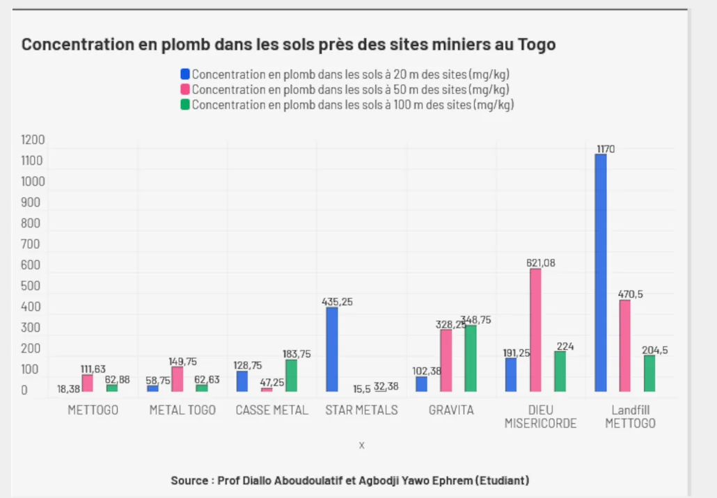 L’étude de l’équipe de recherche du laboratoire de pharmacologie et de toxicologie de faculté des sciences de la santé de l’Université de Lomé (Togo) a permis d’établir les points suivants : Sur 21 échantillons de sol prélevés à proximité de sept entreprises de recyclage de batteries, 14 contenaient des niveaux de plomb jugés par l’Agence américaine de protection de l’environnement comme nécessitant un nettoyage. Les scientifiques ont trouvé les niveaux de plomb les plus élevés dans une décharge située près de l’entreprise Mettogo, qui opère à l’ouest de la ville de Gati. Les scientifiques ont également trouvé du plomb dans des ananas et des tomates à des concentrations plus de 6 400 fois supérieures à la limite maximale recommandée par les Nations unies. Les échantillons ont été prélevés à 20 mètres, 50 mètres et 100 mètres des usines. Les usines soumises aux tests étaient : Star Metals, Mettogo, Gravita, Dieu Misericorde, Casse Metal. L’étude conclut à la nécessité d’une « action urgente », telle que « la mise en œuvre de réglementations strictes sur la gestion des déchets de batteries, la surveillance régulière de l’environnement des sites contaminés et des programmes de sensibilisation pour les communautés exposées ». Interrogé sur ces résultats, les auteurs alertent sur le fait que ses taux de contamination des sols “alarmants” représentent un risque sanitaire pour les personnes vivant et travaillant à proximité des sites testés.