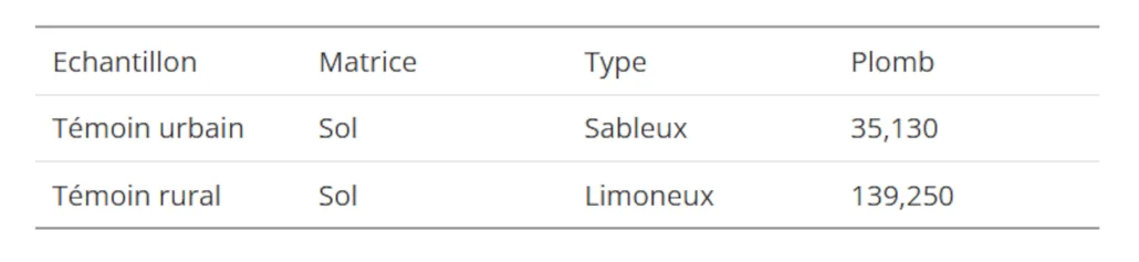 Concentrations en plomb dans les échantillons témoins de sol (Mg/Kg)