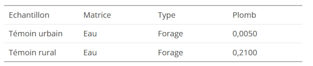 Concentrations en plomb dans les échantillons témoins d’eau (concentration Mg/L)