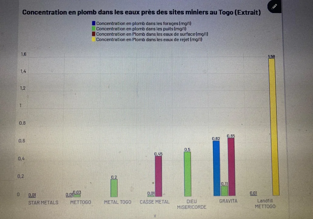 Cette étude réalisée en juillet 2025 sur cinq sites de recyclage de batteries au Togo, révèle des niveaux élevés de plomb dans les sols. Les usines concernées étaient : Star Metals, Mettogo, Gravita, Dieu Misericorde et Casse Metal.