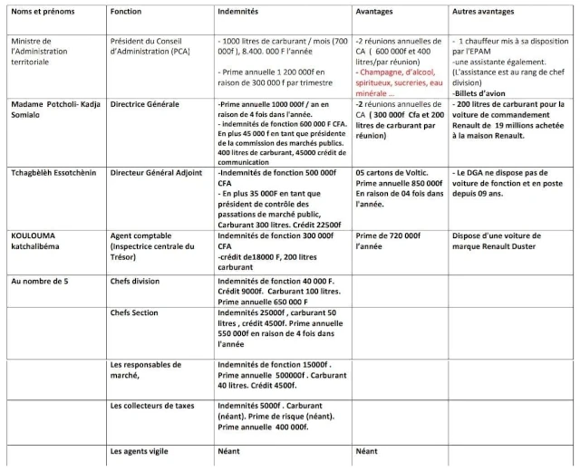 Prenons ensuite la Directrice générale de l’EPAM, Potcholi-Kadja Somialo, commissaire de police. Sa place en temps normal, c’est dans un Commissariat, mais elle est DG de l’EPAM et devenue commissaire divisionnaire en gérant les marchés. Elle préside également le bureau exécutif de la Mutuelle de la police togolaise (MUPOTO). La DG de l’EPAM perçoit 600 000 (six cent mille) FCFA d’indemnité de fonction par mois, 400 litres de carburant par mois (280 000 FCFA), 45 000 FCFA par mois en tant que présidente de la commission de passation des marchés publics, 45 000 FCFA par mois de crédit de communication Togocom, des boissons, des cartons d’eau minérale. Elle perçoit en plus 200 litres de carburant pour sa voiture de fonction Renault, achetée à 19 000 000 (Dix-neuf millions) FCFA à la Maison Renault. Elle reçoit en outre une prime annuelle de 1 000 000 FCFA (250 000 FCFA par trimestre, 4 fois dans l’année). Pour les réunions du conseil d’administration, elle s’octroie 300 000 FCFA deux fois dans l’année, donc 600 000 FCFA et deux fois 200 litres de carburant, soit 400 litres l’année. Elle dispose d’autres avantages par la proximité avec certains commerçants, surtout étrangers. La DG dispose d’un Conseiller qui cumule également indemnités, primes et avantages à voir dans le tableau.