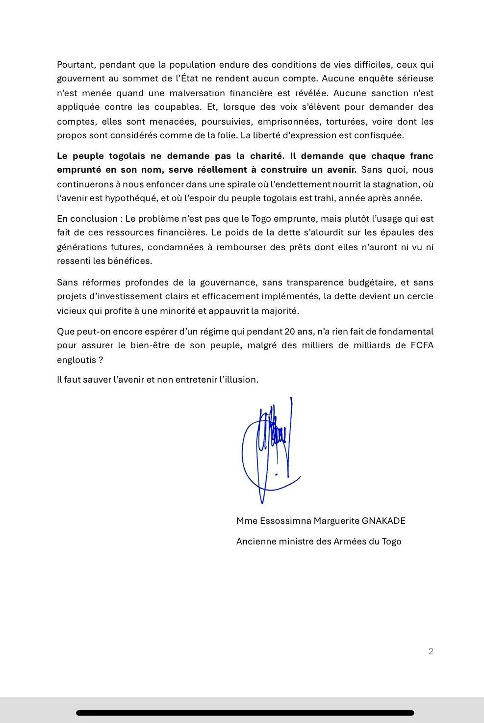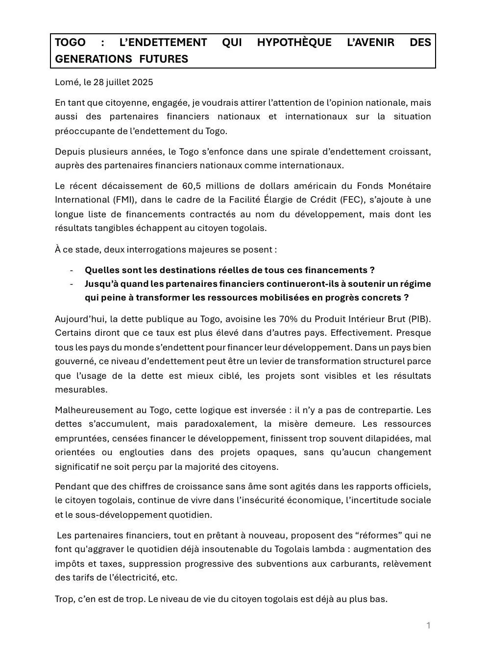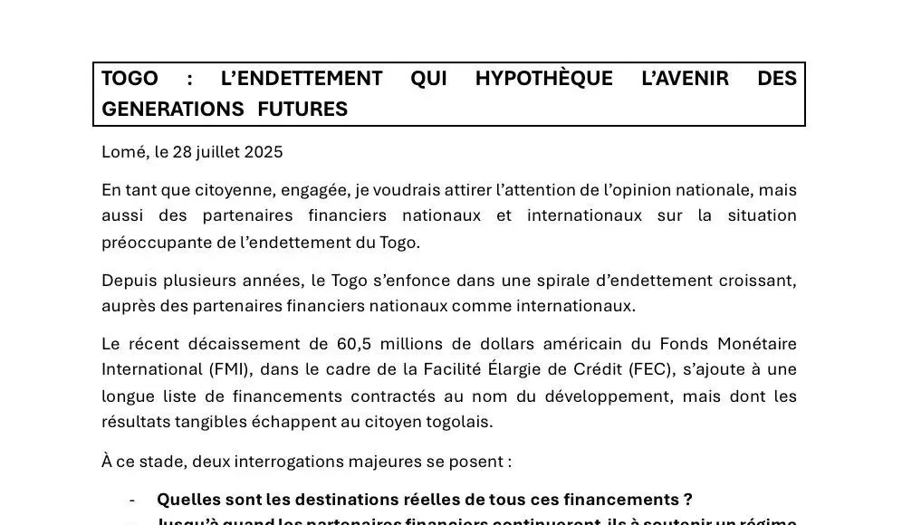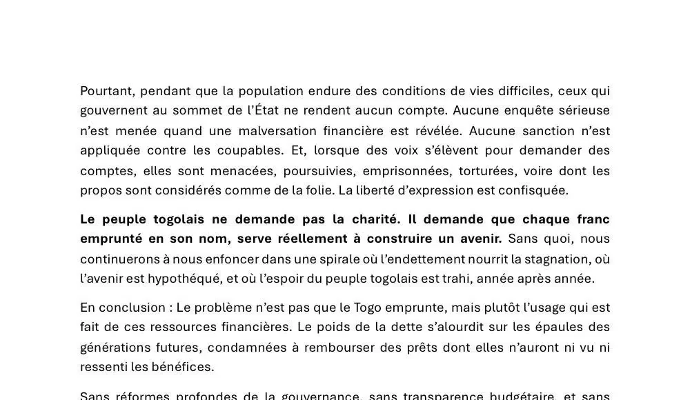 Le peuple togolais ne demande pas la charité. Il demande que chaque franc emprunté en son nom, serve réellement à construire un avenir. Sans quoi, nous continuerons à nous enfoncer dans une spirale où l’endettement nourrit la stagnation, où l’avenir est hypothéqué, et où l’espoir du peuple togolais est trahi, année après année.