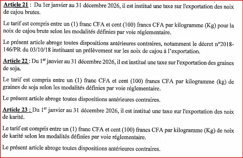 Comme si ce chaos ne suffisait pas, on retrouve dans la loi de finance 2026, des dispositions laconiques qui instituent une taxe identique à l’exportation du soja, du cajou et du karité (voir articles 21, 22 et 23 de ladite loi).