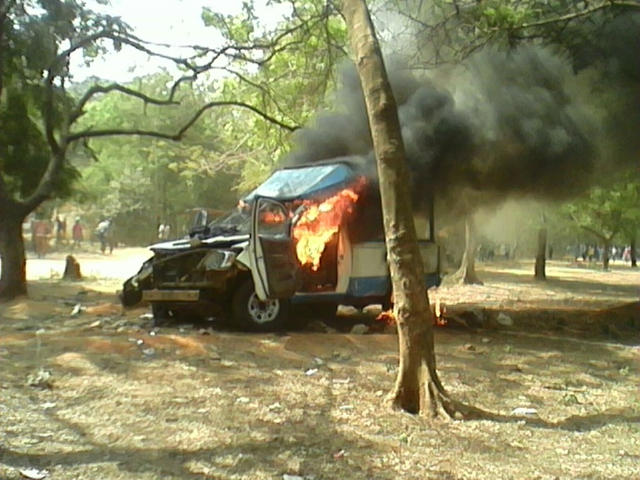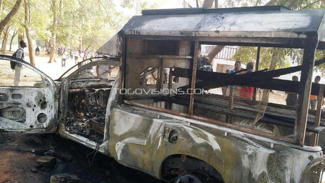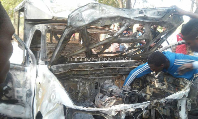 Selon les témoignages des uns et des autres, trois (3) soldats parmi lesquels on compte une femme ont été sévèrement bastonné et grièvement blessés tandis que la voiture immatriculée PN-0456 N au bord de laquelle ils se trouvaient à été ratatinée et brûlée non loin de la DASS.