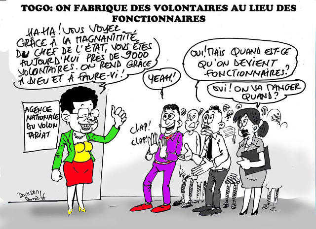Quand ailleurs, les dirigeants financent ou créent des emplois au profit des jeunes, au Togo, Faure Gnassingbé produit des milliers de volontaires, une initiative qui est curieusement vantée comme la solution idéale à l’épineux problème de chômage qui frappe de plein fouet la jeunesse togolaise. Lancé en 2011, le programme de volontariat national présenté comme un outil d’inclusion économique et sociale a produit environ 10.000 volontaires. Ce qui est dommageable, c’est que le pouvoir a substitué ce programme de volontariat aux concours de recrutement. Alors qu’il y a un manque de personnels dans la Fonction publique,