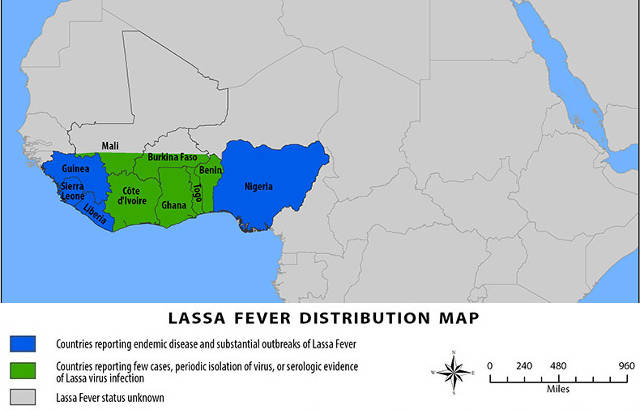 La transmission de la Fièvre de Lassa peut se faire par contact avec les excréments de rongeurs, notamment le rat à multiples mamelles. Le virus se transmet aussi au contact d’une personne infectée via les liquides biologiques : le sang, l’urine, la salive, le sperme, les vomissures, les selles. L’incubation du virus varie de six à vingt et un jours. Les premiers signes de symptômes sont : la fièvre, une fatigue générale, la nausée, des vomissements, la diarrhée, des maux de tête et de ventre et le mal de gorge. L’oedème du cou ou du visage et des saignements sont parfois observés. Il existe un traitement efficace contre la Fièvre de Lassa la Ribavirine. Ce médicament permet de soigner les personnes malades, à condition d’être administré rapidement après l’apparition des premiers symptômes. Concernant la prévention, les mesures suivantes sont préconisées :