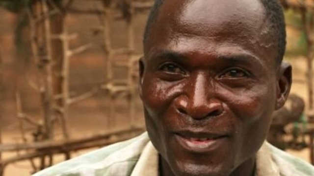 Dans la cour poussiéreuse devant sa hutte aux murs de terre, l’homme salue, enthousiaste.