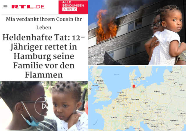 Samedi matin 8 août 2020, dans la ville de Hambourg, au nord de l’Allemagne, il sonnait environ 8 h 30 quand des flammes jaillissent d´un appartement au 7e étage d´un immeuble. Il s’agit de l’appartement habité par une famille africaine d´origine ivoirienne. À l´intérieur, la plupart des membres de la famille agrandie par une visite d´amis, dorment encore. Seul le jeune garçon de 12 ans se trouvait comme par hasard aux toilettes, remarque le début d´incendie, réveille ses parents, ses frères et soeurs, tous les autres et va surtout s´occuper de sa petite cousine de deux ans qui dormait tranquillement dans sa chambre déjà en flammes, qu´il met à l’abri. Le père de famille prend son téléphone et appelle les sapeurs- pompiers.