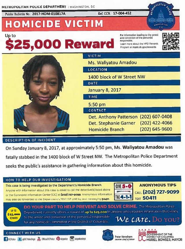Le dimanche 8 janvier 2017, aux environs de 20H05, la police de D.C., répondant à un appel, a découvert Waliyatou Amadou inconsciente, souffrant de plusieurs blessures par arme blanche, dans le couloir d’un immeuble d’habitation coopérative de 4 étages, sis au bloc 1400 de la rue W au Nord-ouest de Washington DC. Transportée à l’Hopital Universitaire Howard, Waliyatou est déclarée morte à 20H35; devenant la troisième victime d’homicide dans ce secteur du Nord-ouest en 2017.