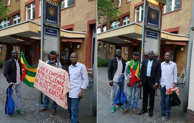Les héros de la manif contre Faure Gnassingbé à Berlin le 9 juin 2016. Photo de gauche : De g. à d.: Alfa Ibrahim Traore; Gafar Tchedre et Fousseni Agbandjalla. Photo de droite : les mêmes camarades combattant et Akondoh Ali (en veste, 3e à partir de la gauche) | Photos : Akondoh Ali / FB