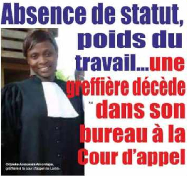Il est des décès qui valent mille mots. Celui de dame Odjeke Anoussra Amonlape intervenu vendredi 17 juin 2022 devrait être Le déclic qui doit réveiller les autorités judiciaires afin que les droits des greffiers sans lesquels la justice n’existerait pas, soient pris en compte et respectés.