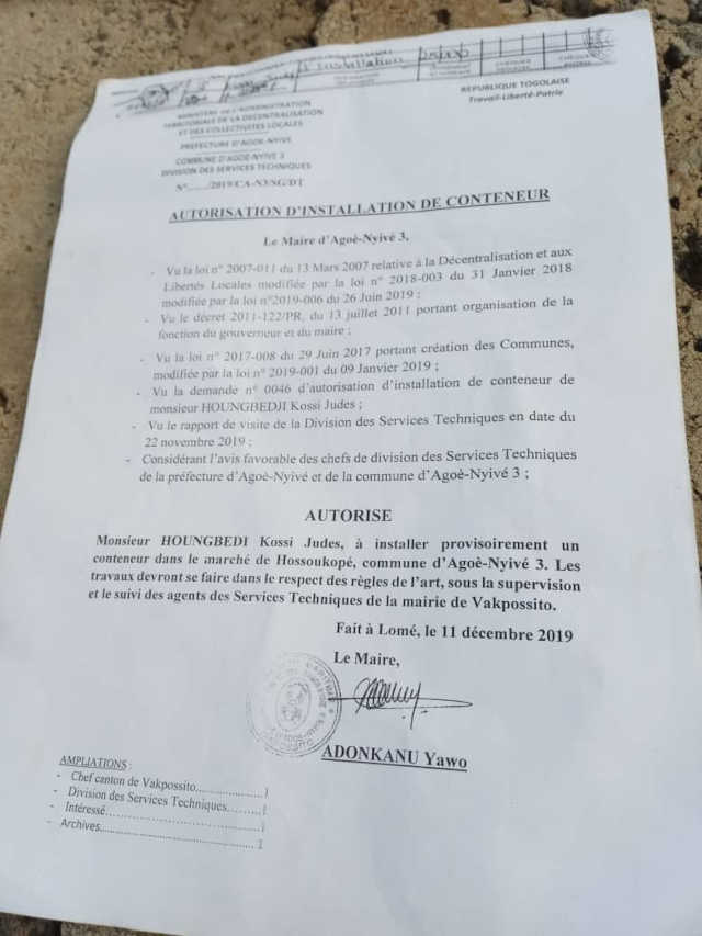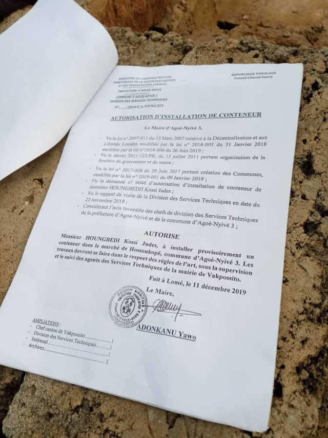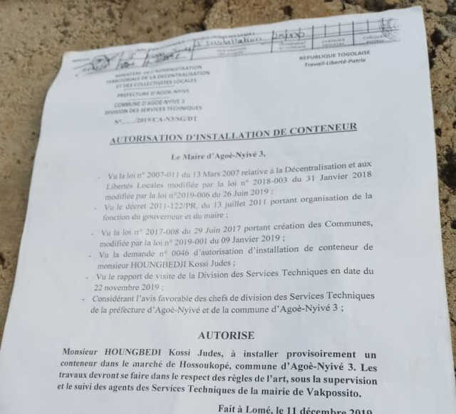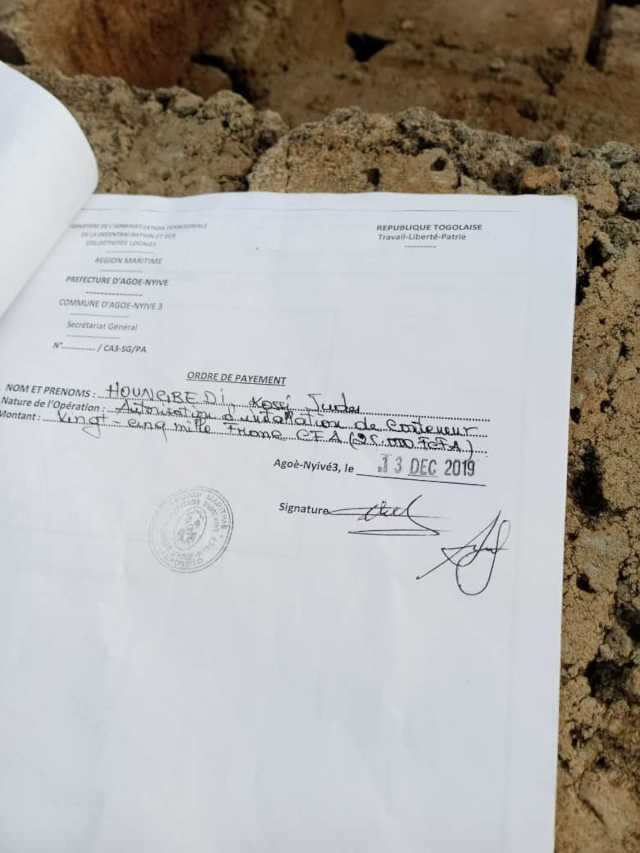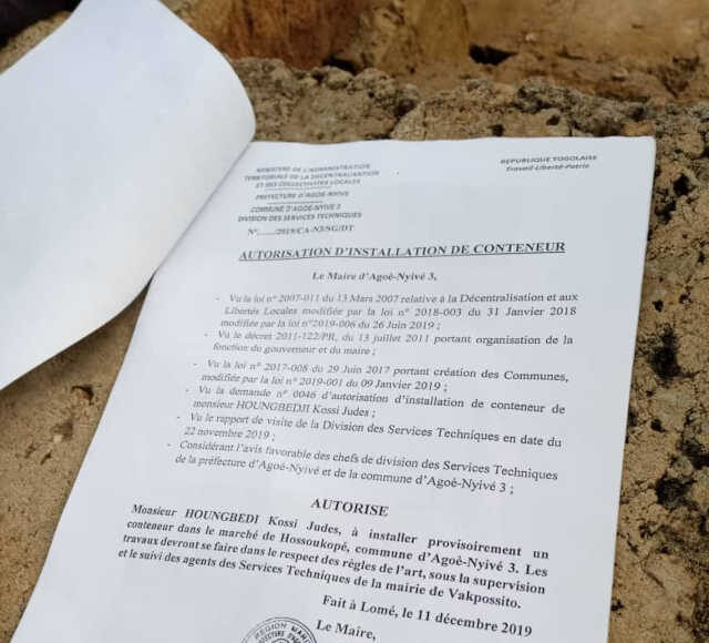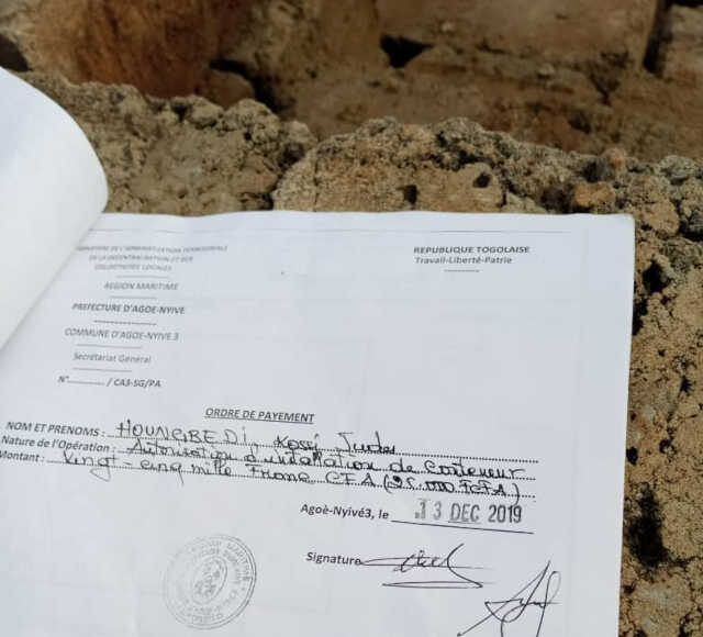 L’histoire se passe dans la commune d’Agoè Nyivé 3 spécialement à Vakpossito. Selon notre source, le maire aurait vendu la réserve administrative, un espace réservé pour la création d’un marché public à Vakpossito. « Cet espace est réservé pour le marché de Vakpossito. Il y avait une portion qui était réservée, c’était libre et quand le maire est arrivé soi-disant qu’ils ont loué ou autorisé à une personne de venir laisser un conteneur, certaines personnes sont venues pour clôturer l’espace. Et elles continuent toujours par travailler sur l’espace. C’est quel genre de conteneur qui nécessite beaucoup de travail comme ça ? Et depuis là, le conteneur ne vient pas mais le travail continuer toujours » informe notre source en martelant qu’un terrain qu’on a dit qu’on a loué à quelqu’un pour déposer un conteneur de frigo mais on vient pour faire la clôture et à l’intérieur on construit des fosses sceptiques et autres.