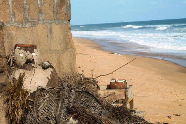 Il est constant que la mer avance sur toute la côte Atlantique. Au Togo, les chiffres officiels parlaient d’un recul de 4 mètres de terre par an. D’autres parlent aujourd’hui de 10 à 15 mètres comme moyenne annuelle, avec quelques variances à des endroits. Il fut une année, la mer aurait avancé de 35 mètres. Cela explique qu’on en soit déjà au 3e tracé de la route Lomé-Aného, les deux premiers ayant été avalés par la mer. Les spécialistes expliquent l’accentuation de l’érosion par les travaux de construction du 3e quai au Port autonome de Lomé, qui ont des conséquences en aval. L’ensablement constaté en amont est compensé par le désensablement en aval, dans les environs d’Aného, rapporte-t-on.