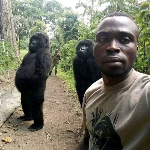 Deux gorilles congolais ont fait sensation sur la toile, lundi, en prenant une pose très décontractée, presque humaine, avec un gardien de la réserve naturelle qu’ils habitent.