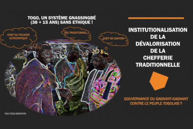 Les chefs traditionnels au Togo sont pour la plupart sous les ordres du Préfet et donc sont administrativement sous les ordres de l’exécutif représenté par Faure Gnassingbé et son armée clanique. De fait, dépendant du financement de l’Etat central, de nombreux chefs traditionnels sont souvent contraints de légitimer Faure Gnassingbé et d’influencer les potentiels électeurs qui ont été inscrits sur les listes électorales pour voter pour le candidat du pouvoir autocrate. Aussi, de nombreux chefs traditionnels, sous prétexte de diffuser un message de paix, sont les principaux artisans et propagandistes des messages appelant à stopper toute contestation contre le système en place. Ce système sous le règne de Faure Gnassingbé n’est pas fondamentalement différent de celui en vigueur sous celui de son père, le Général Etienne Eyadéma Gnassingbé.
