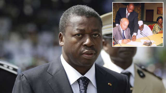 Le président togolais Faure Gnassingbé et en insertion, Eric Aemerding, conseiller de Gilchrist Olympio, chef de la délégation de l’UFC signant l’APG | Infog : 27avril.com / RFI