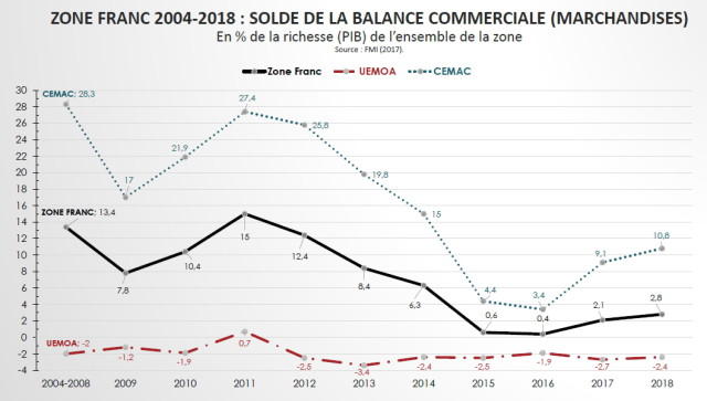 La réalité est que le FCFA a plutôt empêché, voire contrarié, le développement économique et inclusif des Africains de la zone franc. Il faut se demander comment les pays membres de la zone peuvent accepter de constater la détérioration continue et persistant de leur balance commerciale entre 2004 et 2017. La France est-elle en définitive le bon partenaire pour les pays de la zone franc ? Le graphique ci-dessous portant sur la part de plus en plus émoussée du solde (exportations moins importations) de la balance commerciale dans la richesse créée (Produit intérieur brut) au sein de la zone franc ne permet pas de s’en convaincre.