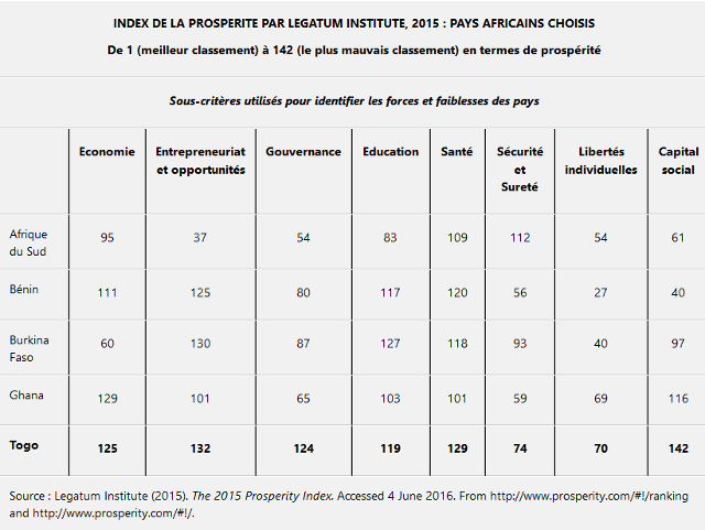 Mais les faiblesses sont palpables en matière d’entrepreneuriat avec très peu d’opportunités de création de richesses et d’emplois (132/142), d’énormes difficultés en matière de santé publique avec des choix erronés de prestige au lieu de renforcer le maillage sanitaire (129/142), une mauvaise gouvernance (124/142), une mauvaise gestion économique (125/142) et plus globalement une mauvaise gouvernance (124/142). Même les chiffres sur les libertés individuelles (70/142) ou la sécurité et la sureté (74/142) qui apparaissent meilleurs doivent être analysés dans le contexte d’un biais occidental. En effet, il s’agit là de la sécurité et des libertés individuelles pour les Occidentaux venant au Togo et moins pour les Togolais y compris la Diaspora habitant ou de passage au Togo. La perception depuis Londres est limitée à des indicateurs qui ne reflètent pas toujours la réalité sur le terrain, rappelant d’ailleurs que les statistiques ne sont qu’un pâle reflet de la réalité. De nombreux pays les mieux classés ont en leur sein des poches de misère. Mais il faut savoir qu’une prospérité accrue peut être réalisée sans avoir nécessairement une croissance économique forte. Inversement, de nombreux pays africains avec une croissance économique élevée sont incapables d’améliorer leur capital social et d’assurer une distribution plus équitable des fruits de la croissance et donc de la prospérité. [15]